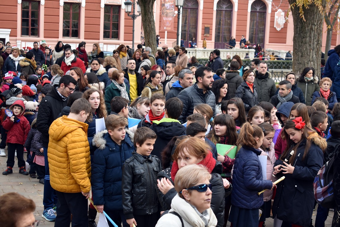 El primer colegio en cantar este año ha sido el Colegio Nuestra Señora del Prado (Marianistas). Después, los alumnos de los CEIP Ferroviario, el Colegio San Francisco Javier, el José María de la Fuente, el Ángel Andrade y ha cerrado la mañana el CEIP Don Quijote. Mañana miércoles será el turno para los alumnos y las alumnas del Colegio Santo Tomás, Pio XII, Carlos Eraña, San José, el Centro de Educación Especial Puerta de Santa María y el CEIP Santo Tomás de Villanueva.