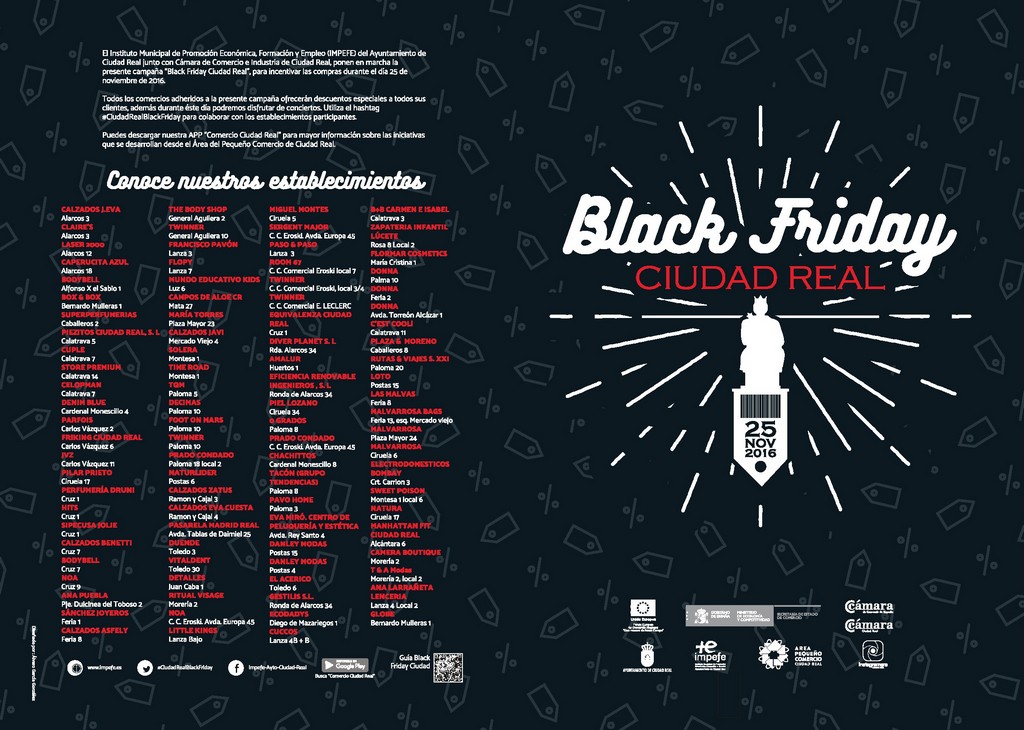 Un centenar de comercios de Ciudad Real ofrecerán descuentos especiales a sus clientes este viernes, 25 de noviembre, dentro de la campaña “Black Friday Ciudad Real”. Se trata de una iniciativa para incentivar las compras dentro del marco del proyecto Dinamización del Centro Comercial Urbano. Programa financiado por la Unión Europea, Fondo Europeo de Desarrollo Regional (FEDER) “Una manera de hacer Europa”, la Secretaria de Estado de Comercio, la Cámara de Comercio de España, la Cámara de Comercio e Industria de Ciudad Real y el IMPEFE.