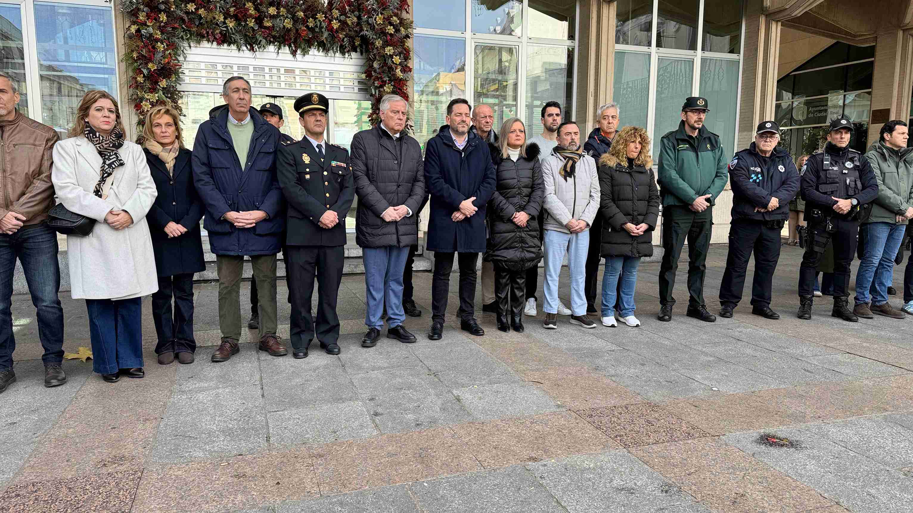 La Plaza Mayor ha acogido el minuto de silencio que han guardado los integrantes de la corporación municipal, representantes del resto de administraciones y de los cuerpos y fuerzas de seguridad del estado, además de numerosos ciudadanos.