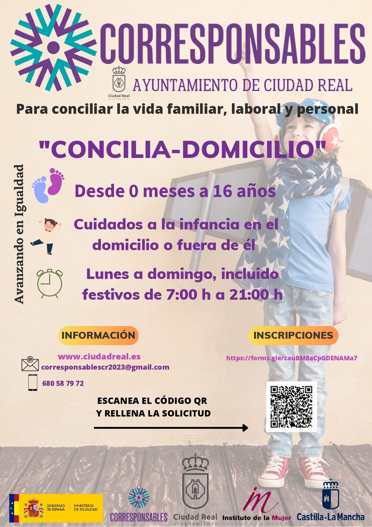 Este programa es un servicio gratuito para las familias empadronadas en nuestro término municipal, las actividades ofertadas son “Concilia-domicilio”, “Aseo bebé”, “Durante el curso”, “Aula recapacita” y “Días sin cole”. Para más información sobre cada una de las categorías del Plan Corresponsables se puede escanear el código de barras que aparecen en los carteles o visitar la página https://forms.gle/cauBM8aCpGDENAMa7. También se puede solicitar mayor información en el número de teléfono 680 58 79 72, a través del correo electrónico corresponsablescr2023@gmial.com o en la página web oficial del Ayuntamiento de Ciudad Real www.ciudadreal.es.
