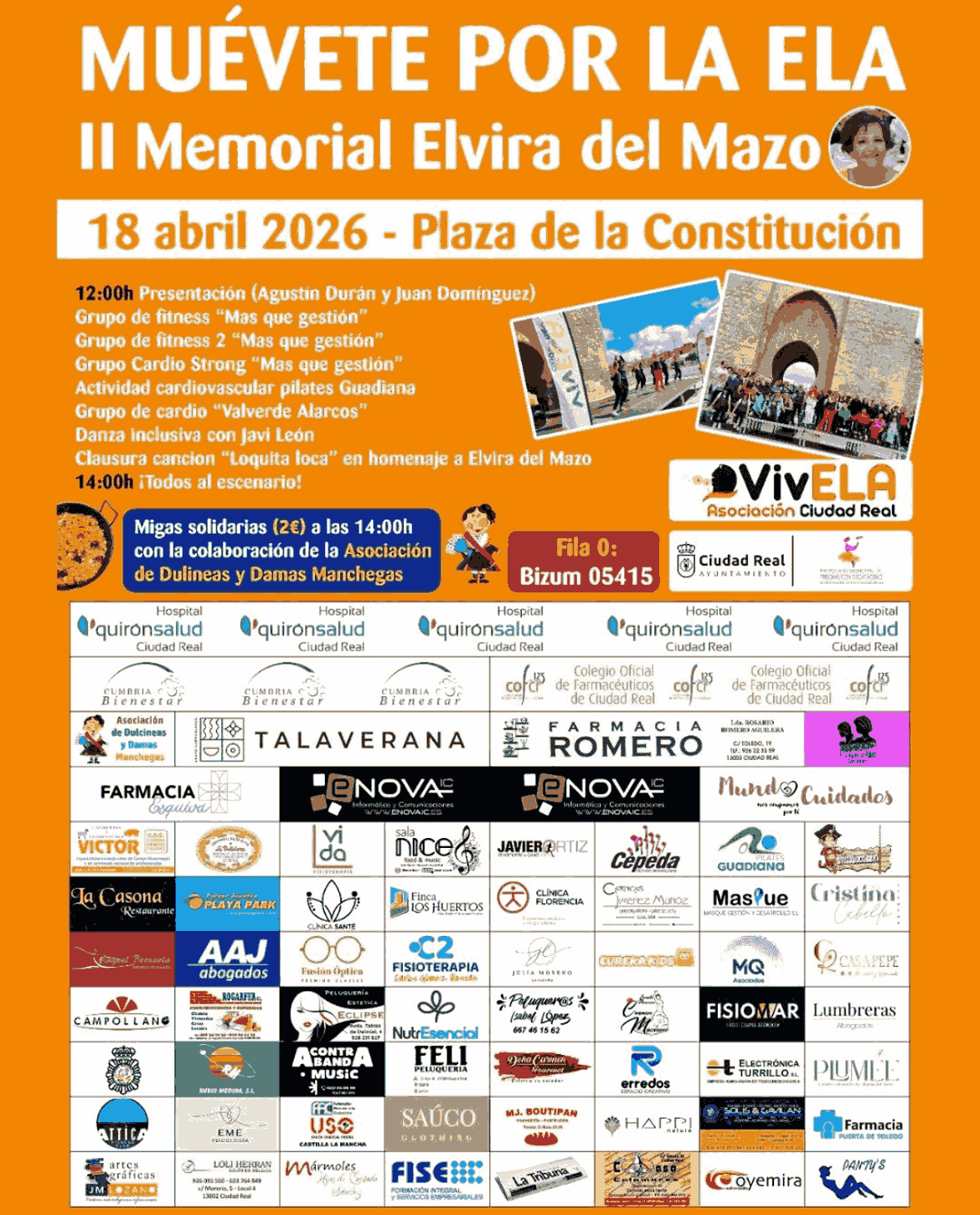 El próximo sábado, 18 de abril, desde las 12:00 horas la Plaza de la Constitución de Ciudad Real volverá a llenarse de solidaridad en la tercera edición del evento Muévete por la Ela, II Memorial Elvira del Mazo, que organiza la Asociación VivELA en colaboración con las concejalías de Servicios Sociales y de Participación Ciudadana junto con el Patronato Municipal de Personas con Discapacidad.