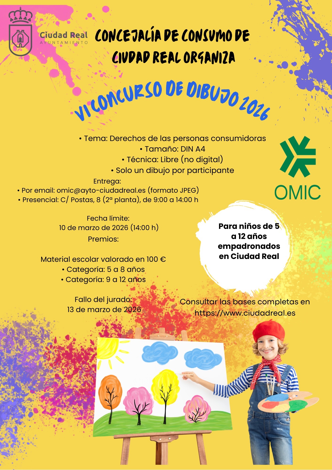 El Ayuntamiento de Ciudad Real, a través de la Concejalía de Consumo convoca el VI Concurso de Dibujo “DÍA MUNDIAL DE LOS DERECHOS DE LAS PERSONAS CONSUMIDORAS 2026”. La finalidad de este concurso es conmemorar el 15 de marzo, “DÍA MUNDIAL DE LOS DERECHOS DE LAS PERSONAS CONSUMIDORAS”, dar visibilidad y velar para que sean respetados los derechos de las personas consumidoras, así como fomentar la creatividad en los niños y niñas de nuestra ciudad.