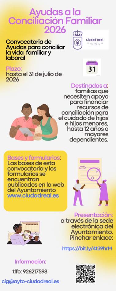 El Ayuntamiento de Ciudad Real, a través de la Concejalía de Igualdad, ha abierto el plazo de solicitud de la convocatoria de ayudas destinadas a la conciliación de la vida personal, familiar y laboral correspondiente al año 2026.