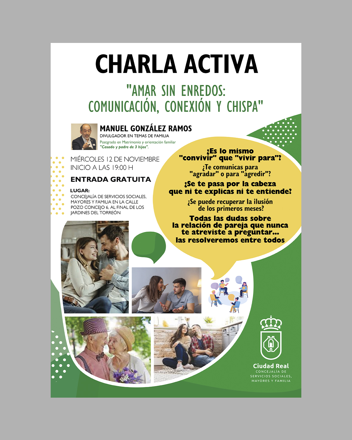 Uno de los objetivos del Programa Municipal de Familia que, de forma transversal y constante, realiza el Ayuntamiento de Ciudad Rea es ”poner en marcha charlas, conferencias, seminarios y talleres grupales dirigidos a promover las competencias y capacidades de las figuras parentales, de cara a favorecer la convivencia familiar y el desarrollo y bienestar de los menores a cargo”. La Charla Activa que programamos para el 18-06-24 “Padres, ¿cómo soñáis a vuestros hijos? El final depende del principio” incide directamente en el objetivo mencionado. El comunicante de esta Charla Activa es Ricardo Gay Férriz. Ricardo ha dedicado gran parte de su vida profesional a las familias y a sus hijos, de modo especial a los adolescentes. En la actualidad es consultor educativo y coordina el Grupo de Estudios Ítaca. Una de sus grandes pasiones es la orientación familiar y ha trabajado e impartido talleres con orientadores familiares en Europa, África, Asia y América. Es profesor colaborador de la Universidad UCASAL, de Argentina. Ha sido director general de la Asociación Europea de Educación Diferenciada (EASSE), domiciliada en Londres, y profesor del Master de Asesoramiento Familiar del Centro Universitario Villanueva de la Universidad Complutense de Madrid. Ricardo es un enamorado de la escalada, el alpinismo y la naturaleza.